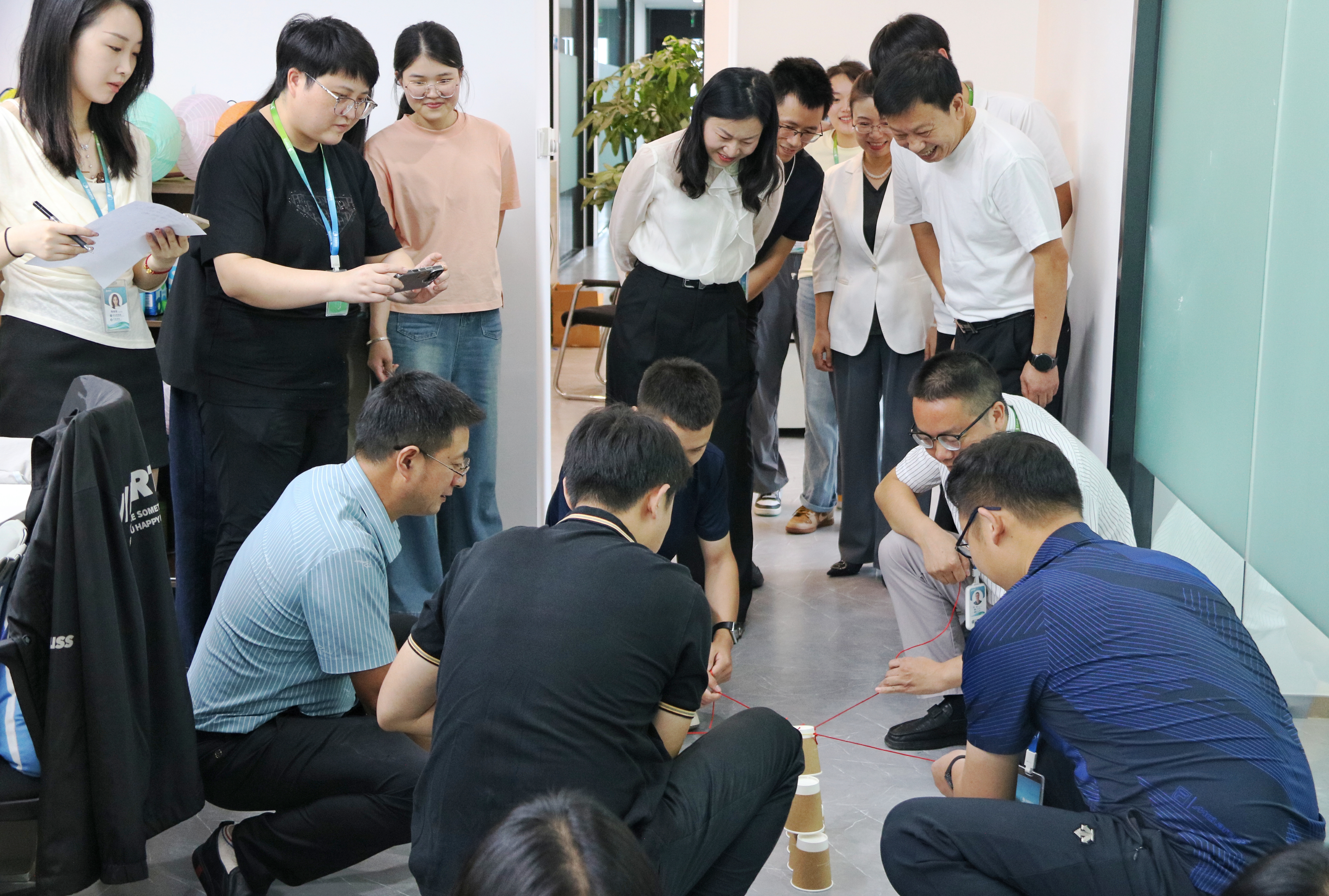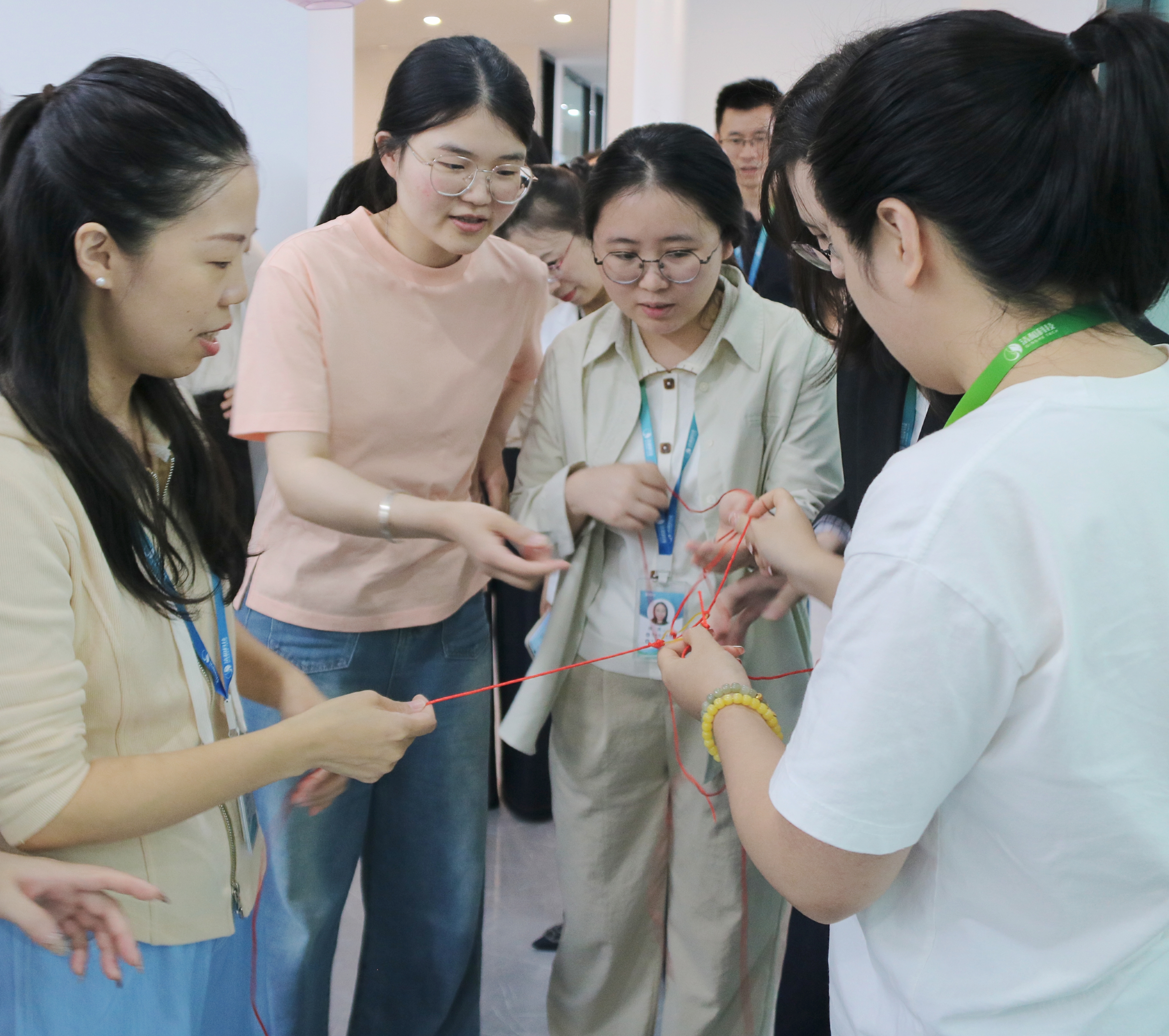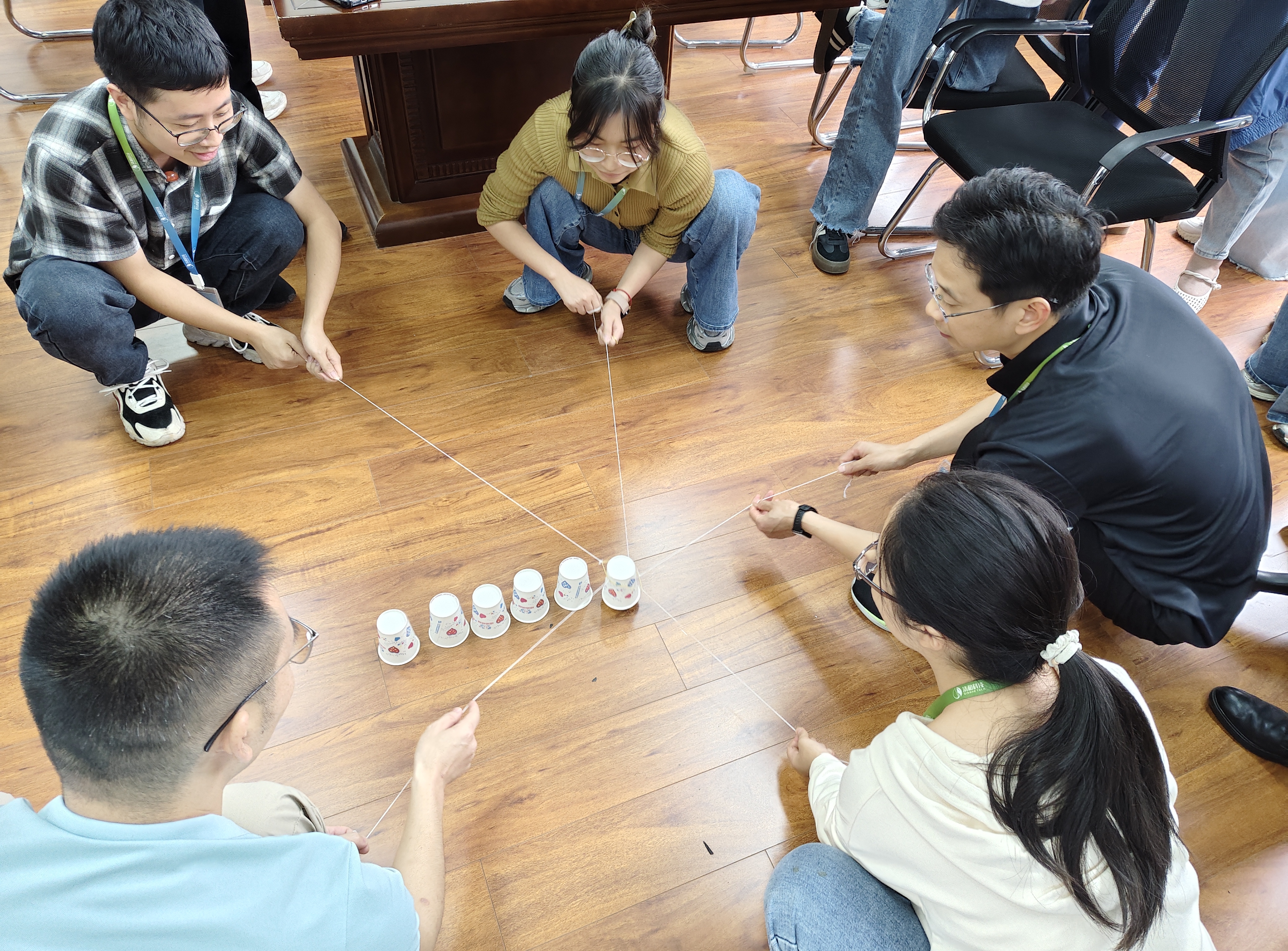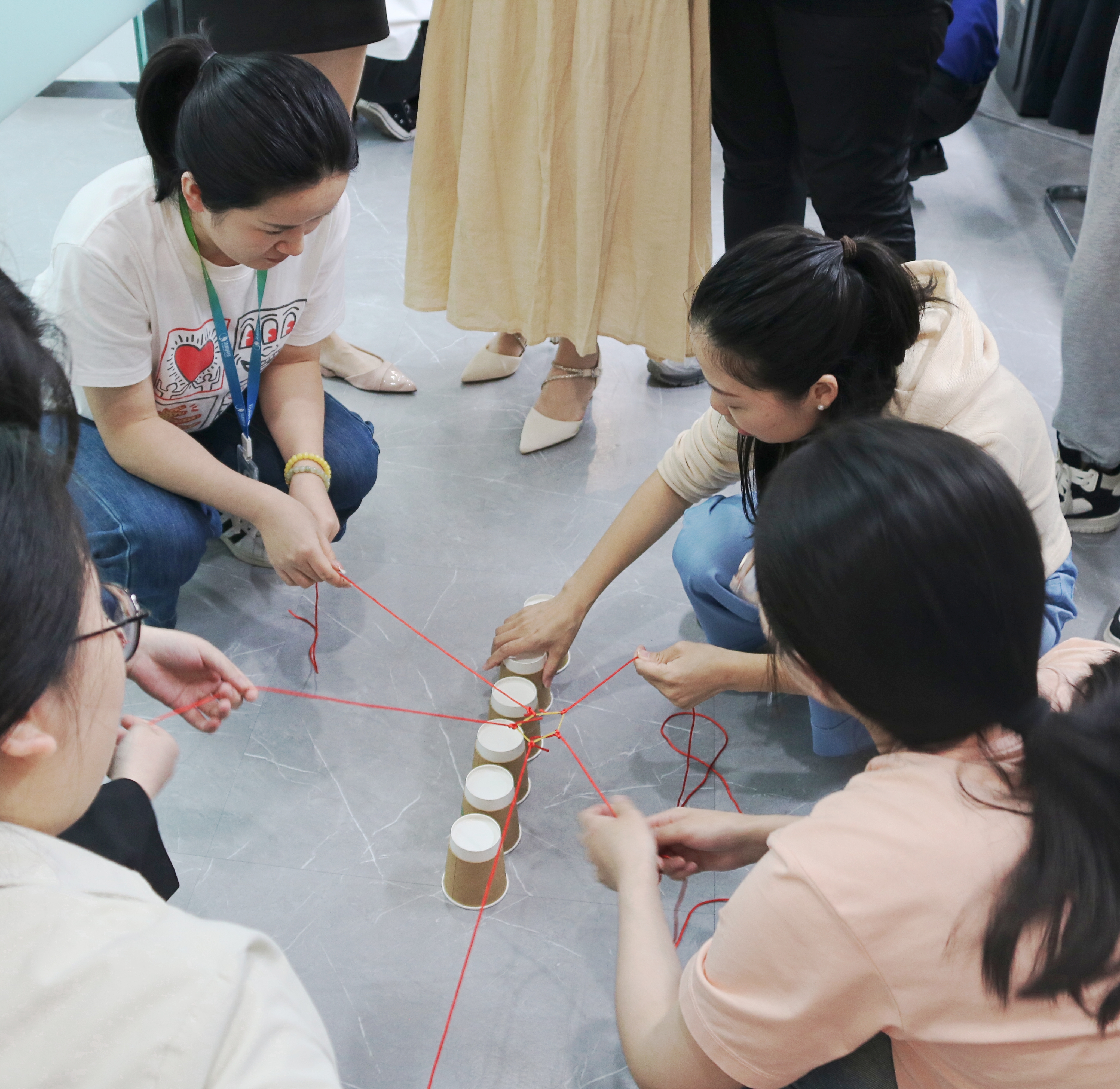 活动的热闹从“步步登高”游戏开始,5人一组,每人拉一根套着橡皮筋的绳子,默契协作搭建3层纸杯塔。屏幕两端的队伍虽隔空竞技,却在“稳住!慢一点!”的小声提醒里展现出同样的协作力。最终用时最短的队伍收获掌声。