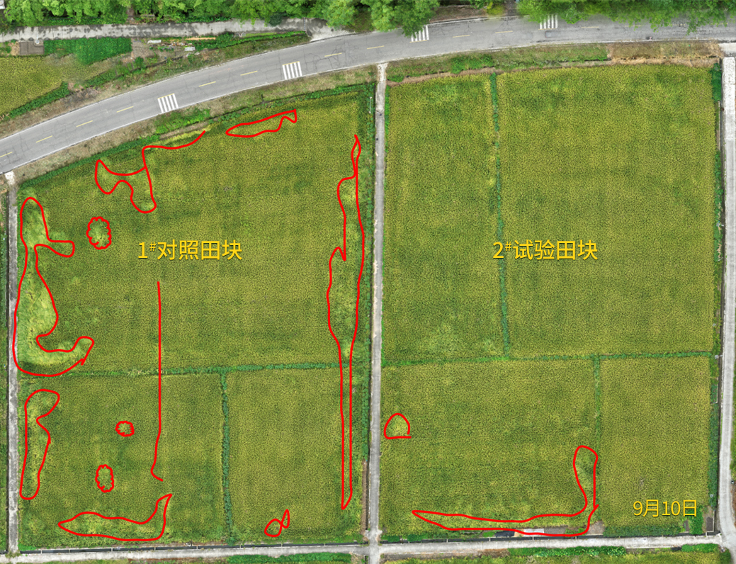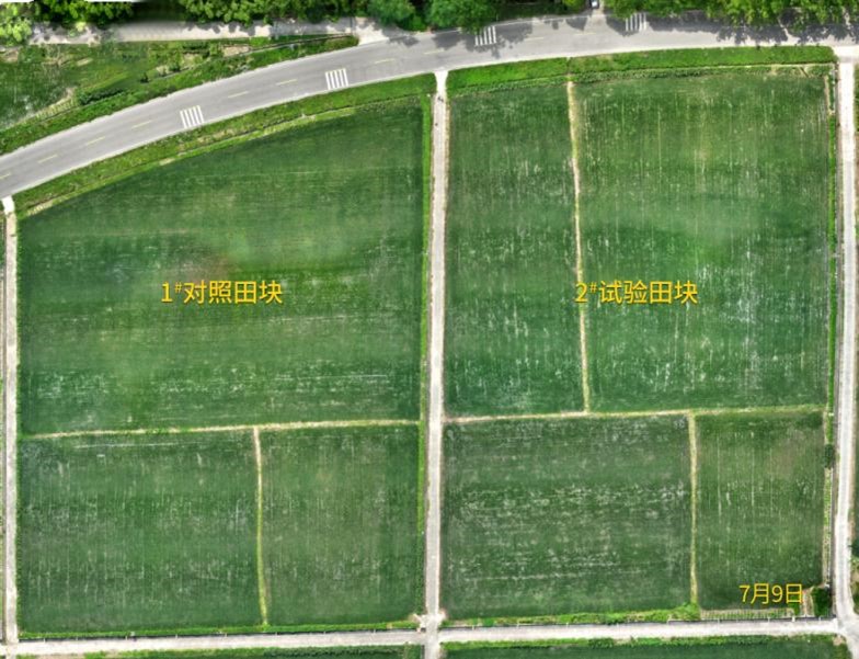我们选取约24亩稻田分为1#对照田块和2#试验田块,1#对照田块按照当地种植方式种植,2#试验田块的农药和化肥用量较对照田块减少50%,并先后分7次向试验田块喷施自主研发的各类微生物菌剂和微藻制剂。